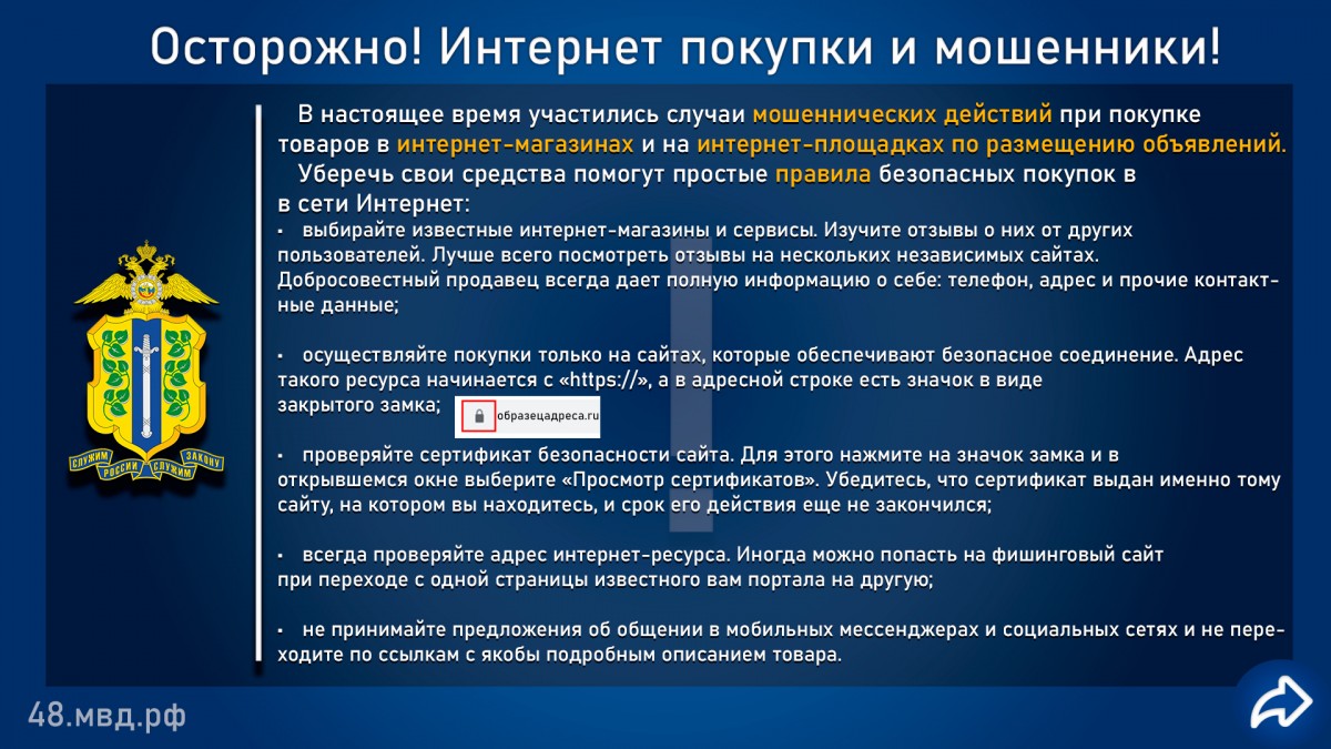 Если решили сделать покупку в сети Интернет, помните, что это один из самых распространенных видом мошенничеств, поэтому, что бы получить товар заказывайте его на проверенных площадках, проверяйте отзывы о сайтах и продавцах и используйте возможности такой услуги как «Безопасная сделка».