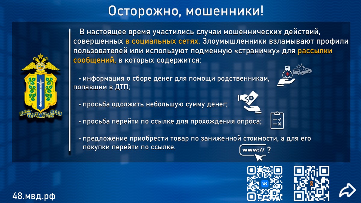 Помните, люди которые Вам звонят и сообщив, что с Вашим родственником случилось несчастье требуют денежные средства – мошенники, кем бы они не представлялись!!! Полиция, ФСБ, Следственный комитет, Прокуратура такие звонки не осуществляет! Деньги не требует!